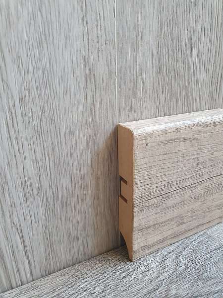 Высота плашек – 80мм. Она позволяет заводить под плинтус стеновые панели и полностью закрывать технические зазоры между стеной и покрытием пола. Можно не выравнивать стены и пол в месте их стыка.
